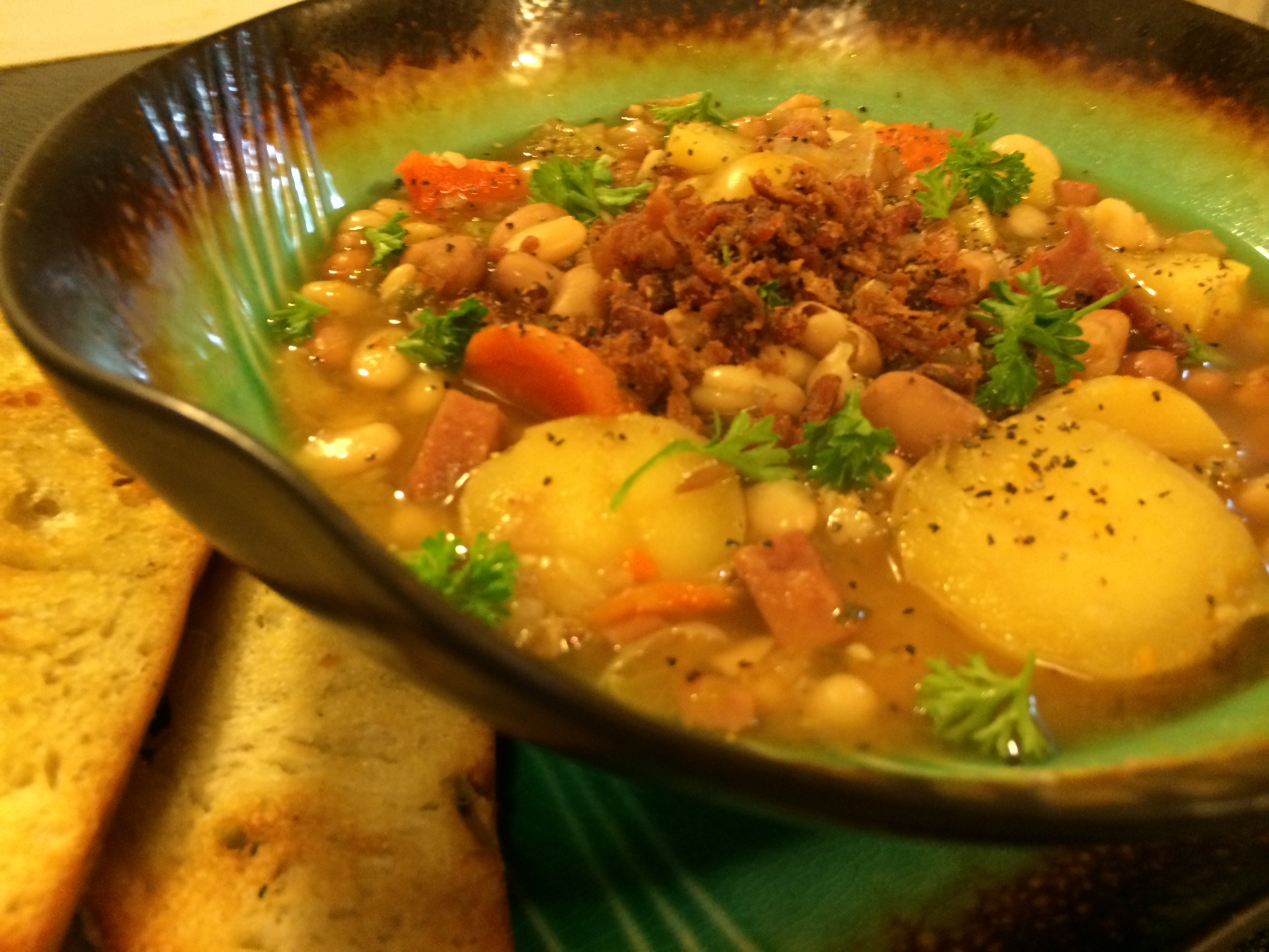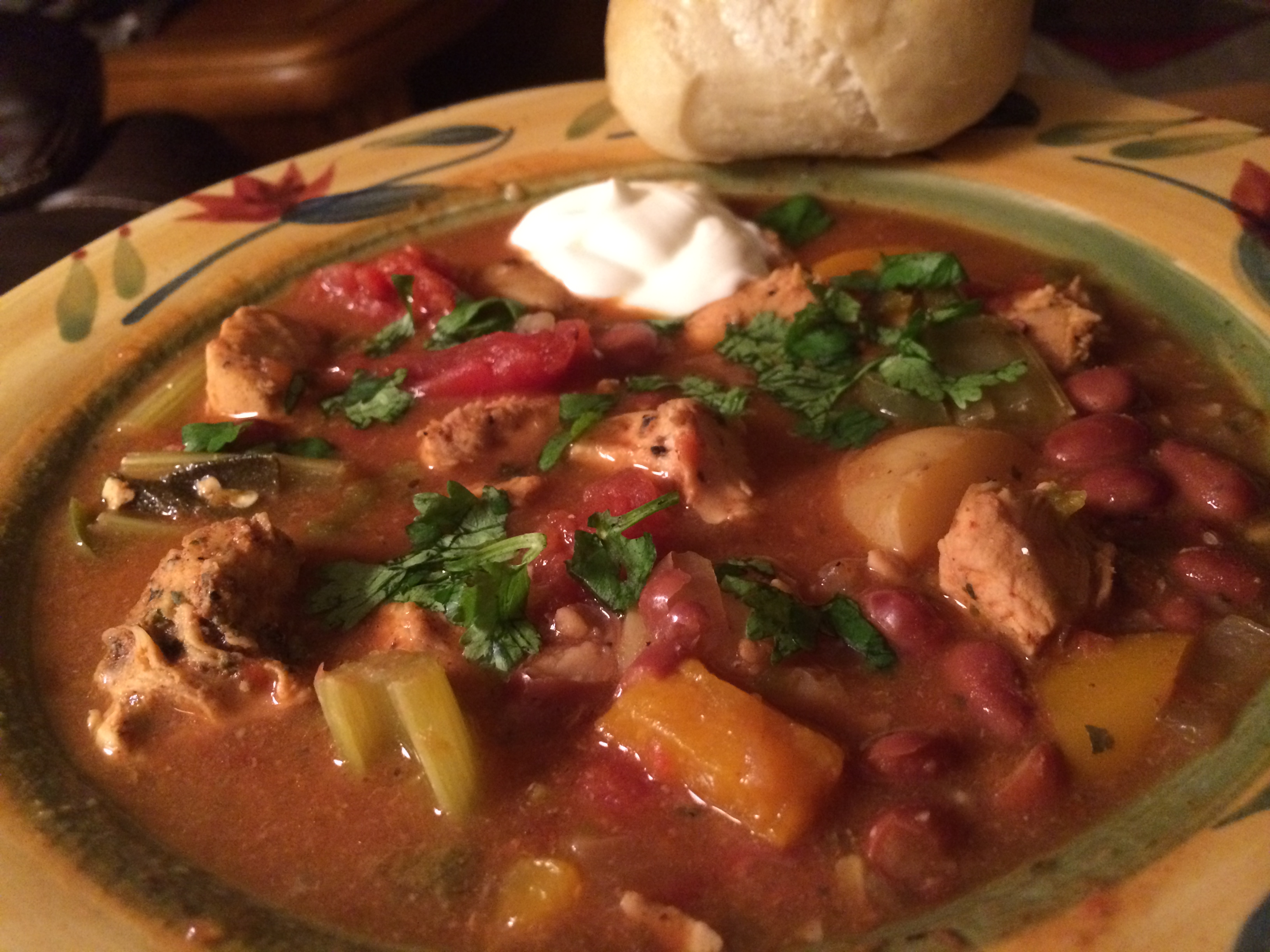 Upon serving, top with fresh chopped cilantro, a dollop of sour cream, and squeeze of fresh lime juice.  Add a crusty thick slice of bread or sour dough dinner role on the side.