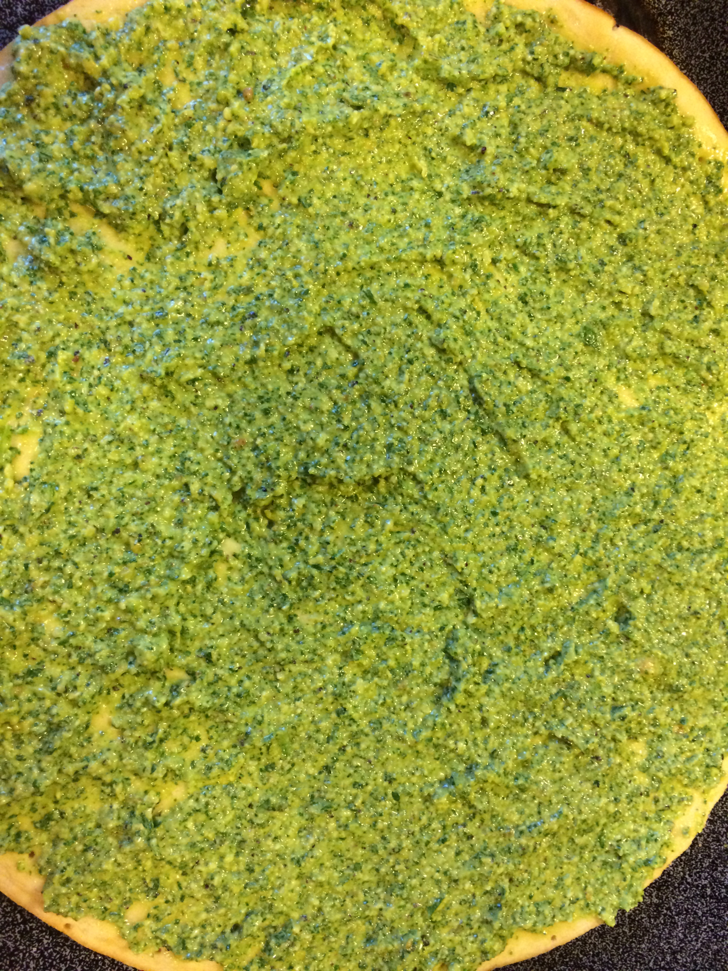 I was looking for a way to get more veggies in my diet and what is more green than pesto?! Even so, I wasn’t in the market for a heavy pasta meal, wanting to go a bit lighter, I decided to make a quick and easy pizza. I made this recipe without the baked pesto chicken on top, so it was truly vegetarian, but will definitely add the bird next time I make this dish.