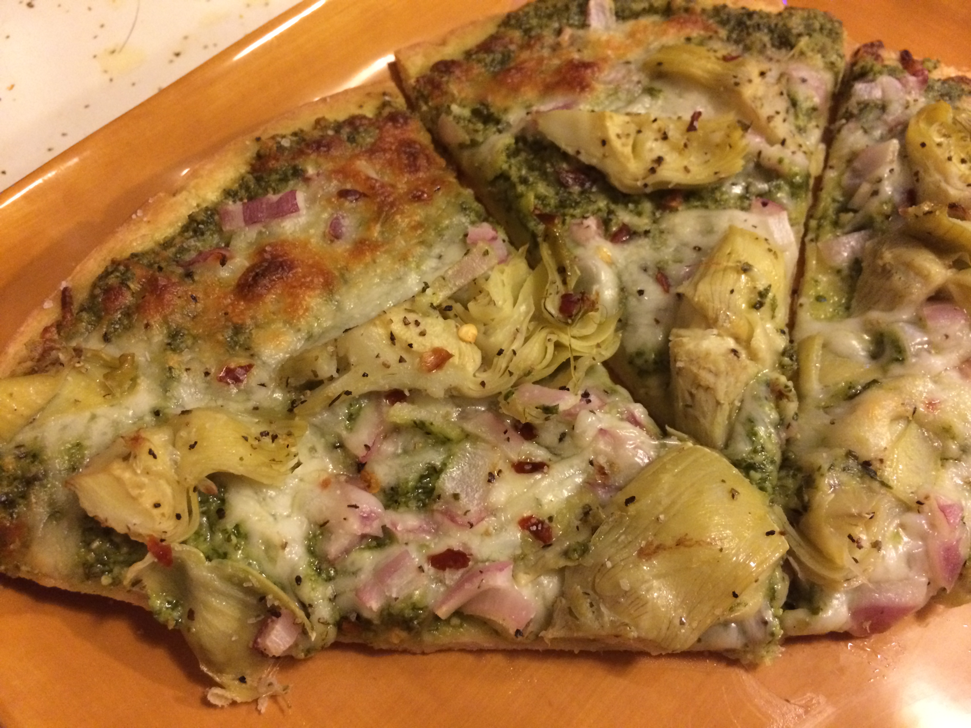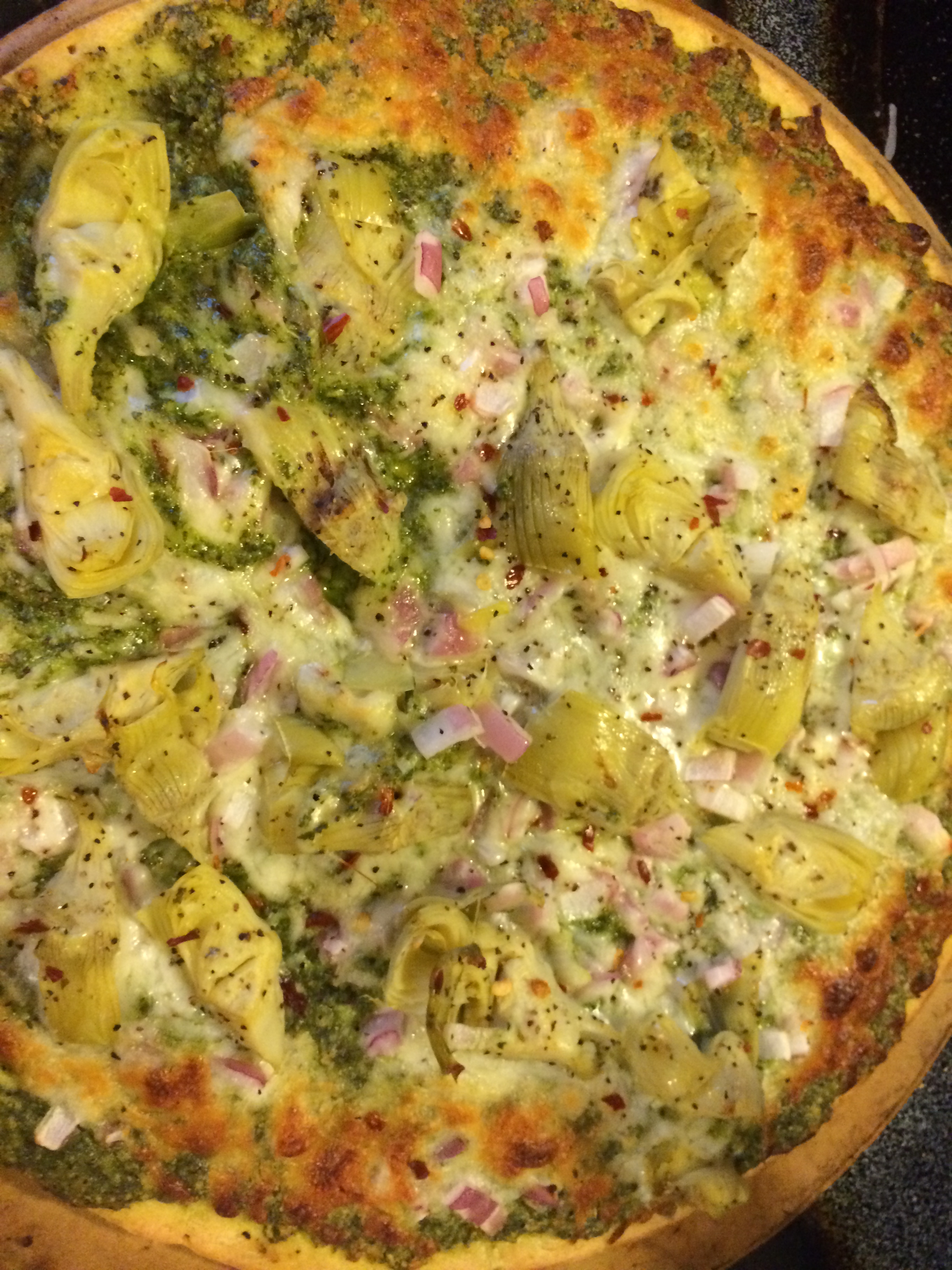 PESTO CHICKEN PIZZA WITH ARTICHOKE HEARTS